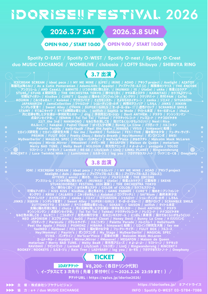 会場:Spotify O-EAST、Spotify O-WEST、Spotify O-nest、Spotify O-Crest、duo MUSIC EXCHANGE、WOMB、clubasia、LOFT9 Shibuya SHIBUYA RING (※9会場連動)